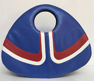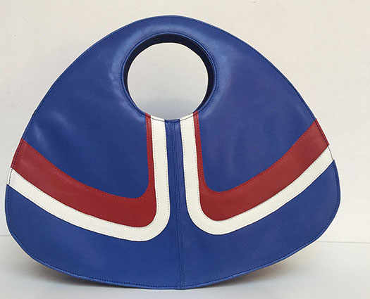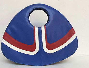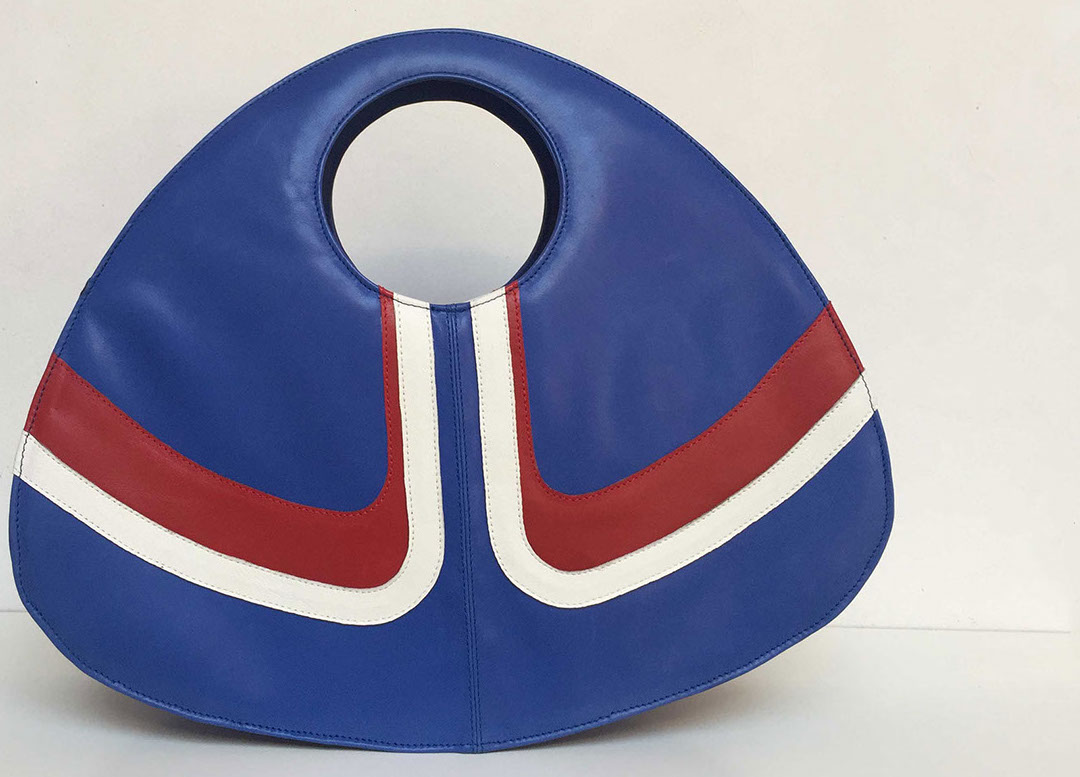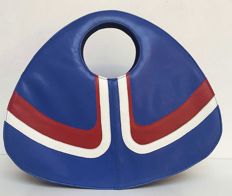 Handmade bag in blue, white and red leather, with darkgrey lining.